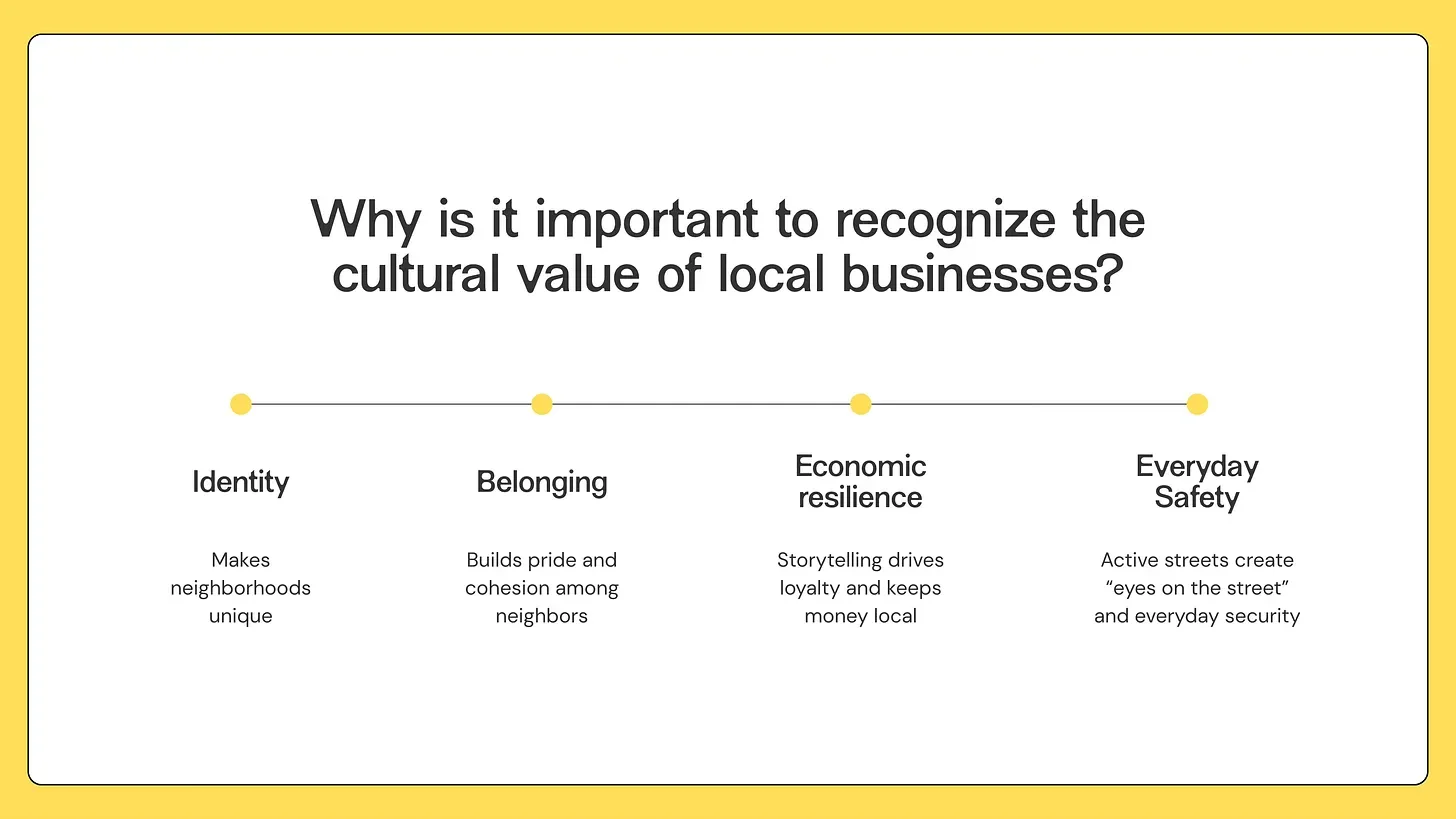 There’s still much more to explore about the relationship between small and local businesses, and how both contribute to our collective sense of place. I look forward to continuing this research and sharing more reflections along the way.